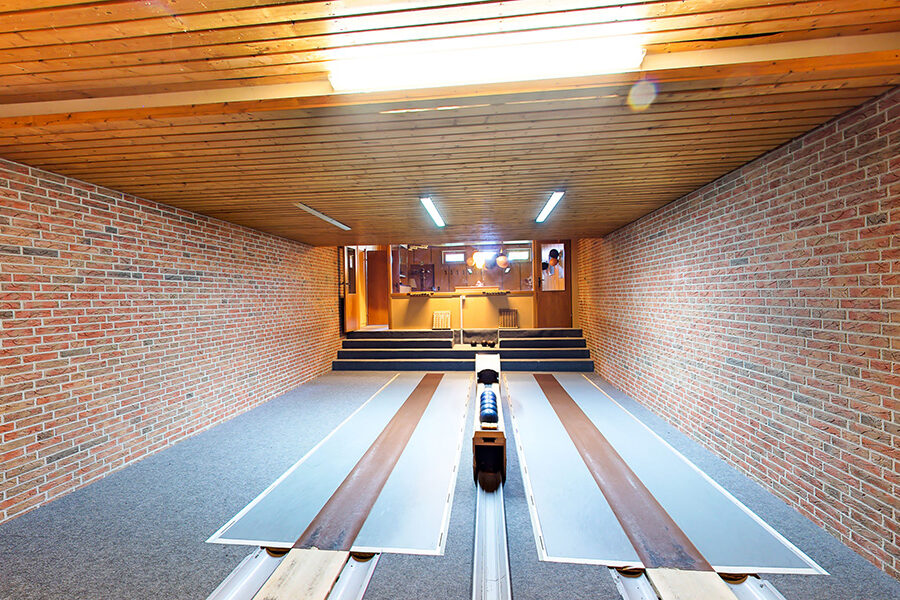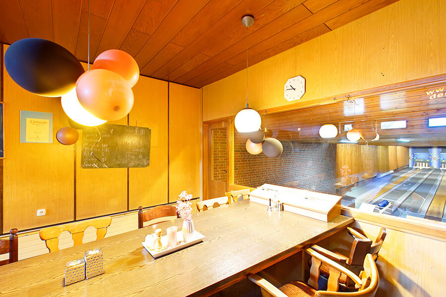 Die beiden Kegelräume verfügen jeweils über einen eigenen Ess- und Sitzbereich, von dem aus man die Bahn gut im Blick behält. So entsteht eine ruhige, fast gemütliche Atmosphäre, in der man spielen, sich austauschen oder einfach einmal kurz durchatmen kann. Eine Musikanlage steht ebenfalls bereit.